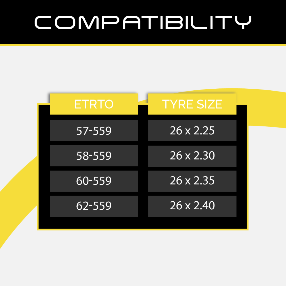 • Suitable for tyre sizes:  26" x 2.20 through  to 26" x 2.40