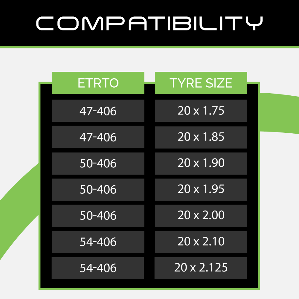• Suitable for tyre sizes:  20" x 1.75 through to 20" x 2.125