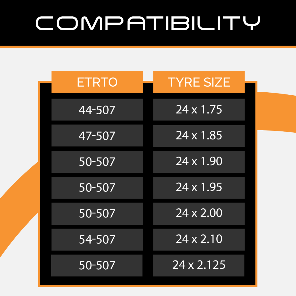 - Suitable for tyre sizes: 24 x 1.75 through to 24 x 2.125
