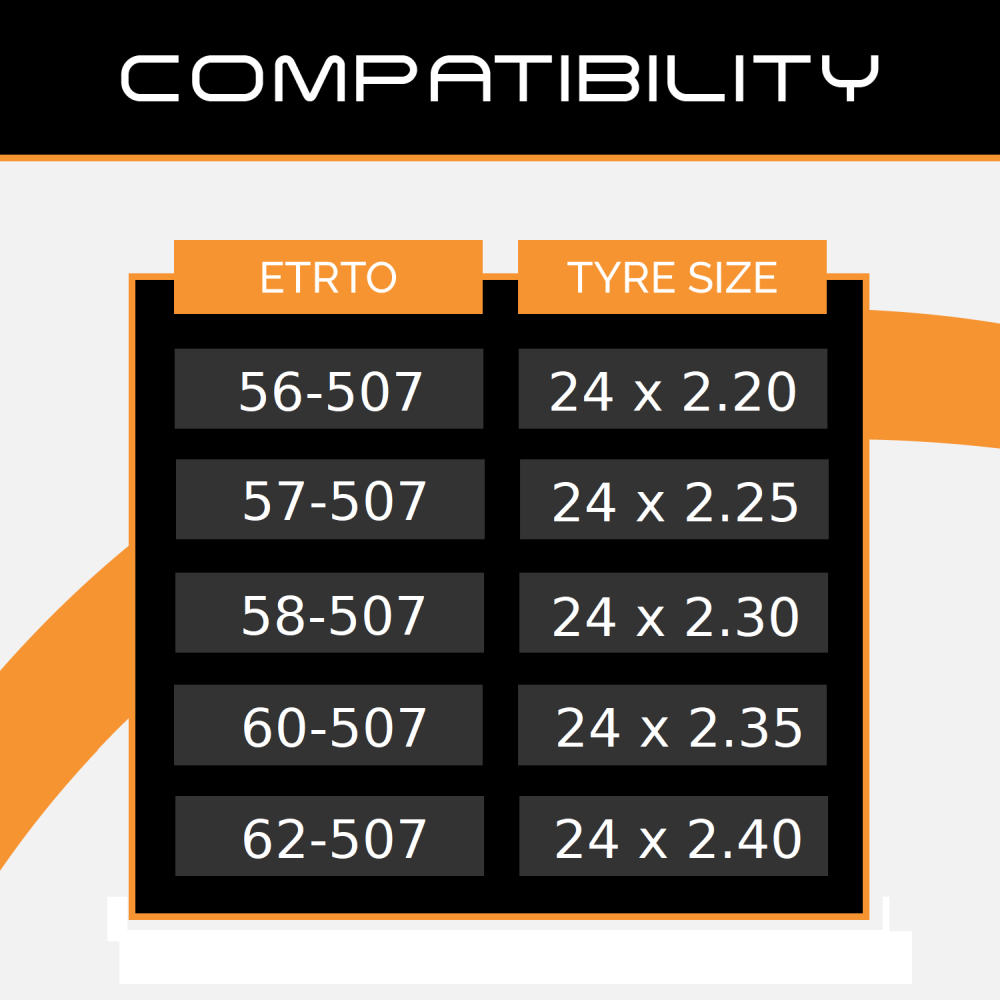 - Suitable for tyre sizes: 24" x 2.20 through to 24" x 2.40