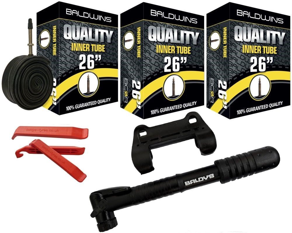 Baldwins Bike Inner Tubes 26 x 2.20 to 2.40 Presta Valve & Tyre Levers & Mini Pump (PACK OF 3)