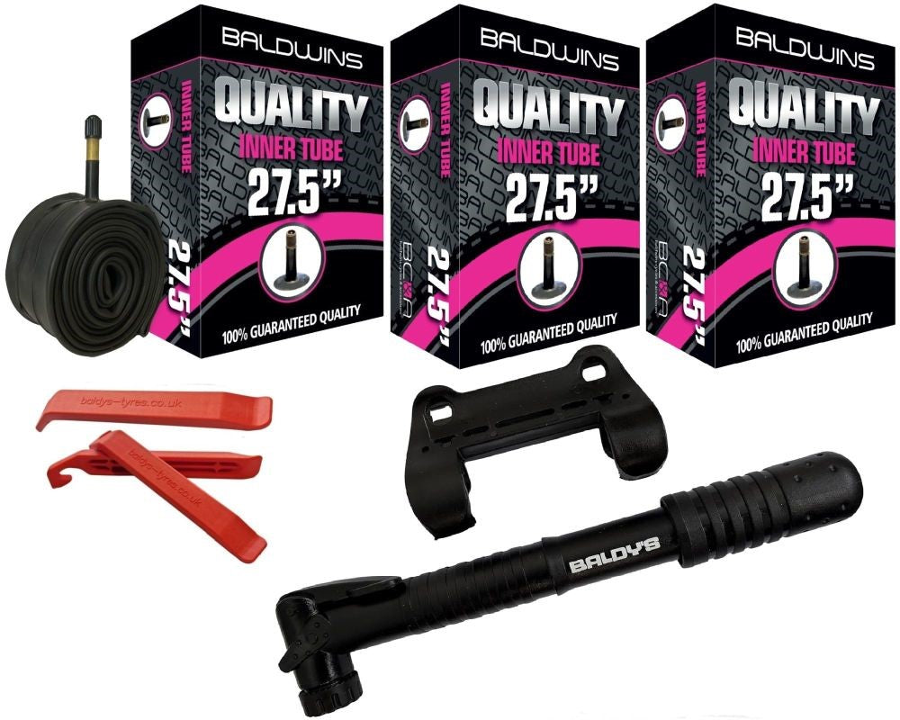 Baldwins Bike Inner Tubes 27.5 x 1.75 to 2.125 Schrader Valve & Tyre Levers & Mini Pump (PACK OF 3)