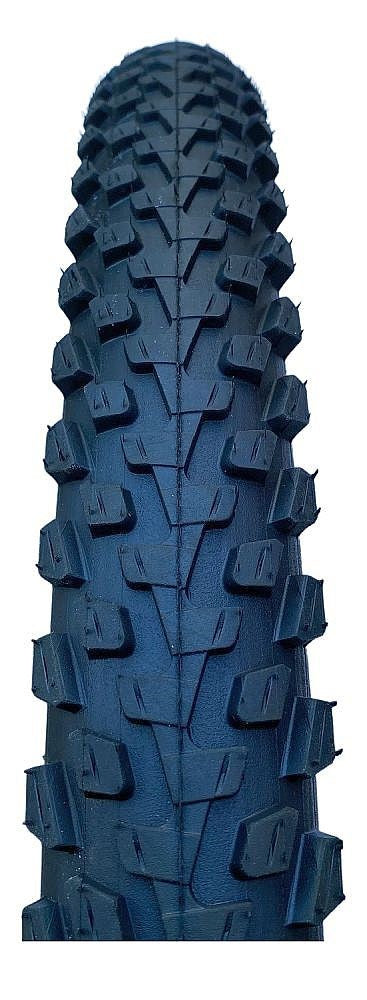 On the central rib it rolls easily over hard paths, while the strong outer lugs give it great off-road traction.