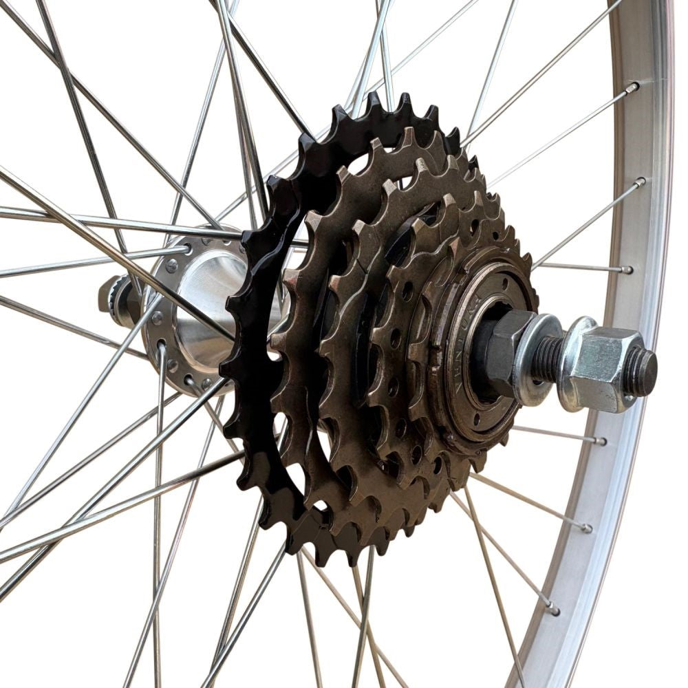 Our 5 speed 700C rear hybrid / trekking bike wheel is constructed with Mach1 silver alloy rim, silky smooth sealed bearing hub with nutted axle and silver steel spokes.