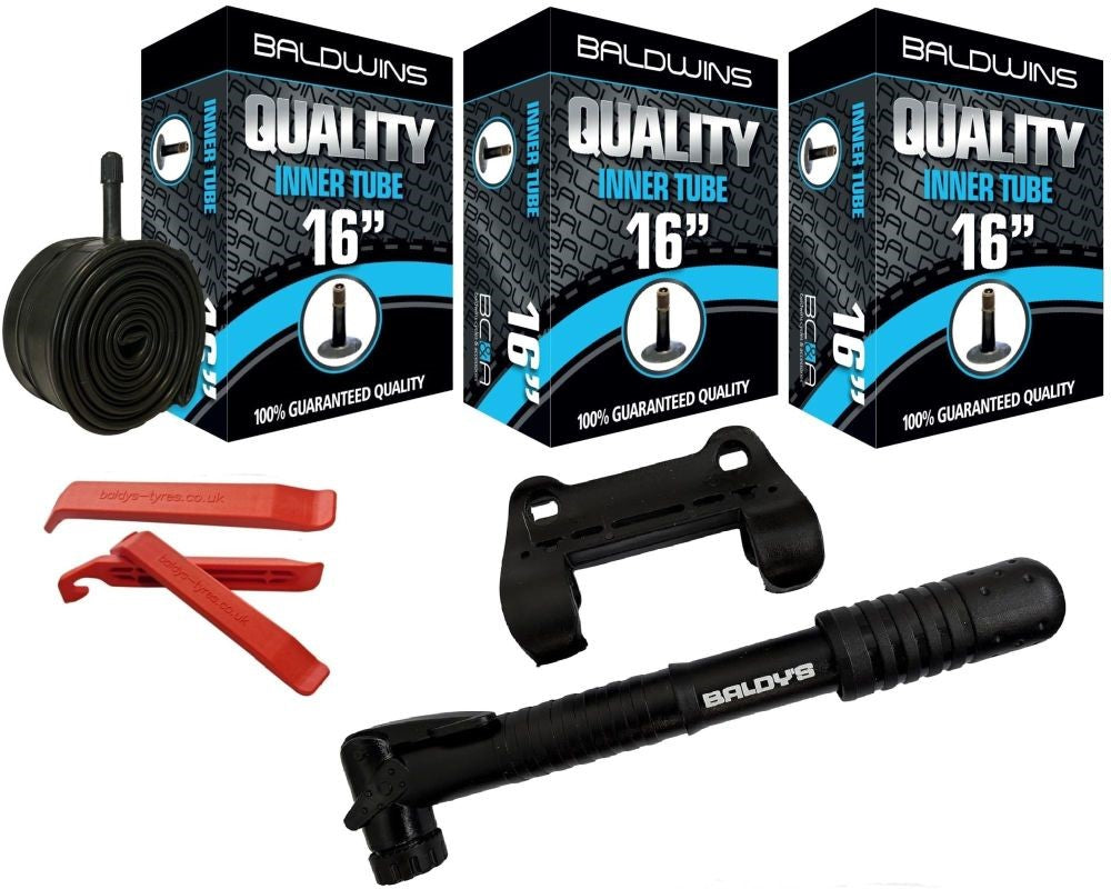 Baldwins Bike Inner Tubes 16 x 1.75 to 2.25 Schrader Valve & Tyre Levers & Mini Pump (PACK OF 3)