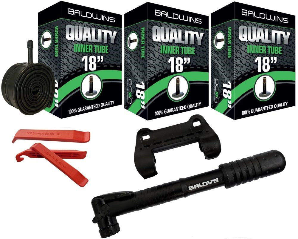 Baldwins Bike Inner Tubes 18 x 1.75 to 2.125 Schrader Valve & Tyre Levers & Mini Pump (PACK OF 3)
