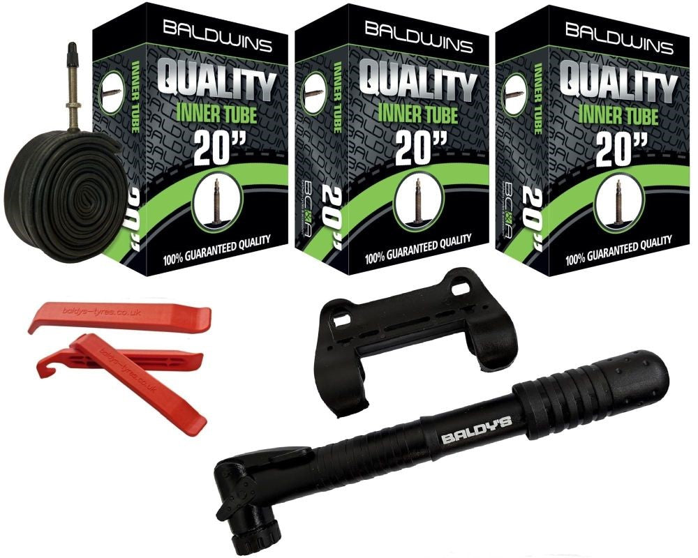 Baldwins Bike Inner Tubes 20 x 1.75 to 2.125 Presta Valve & Tyre Levers & Mini Pump (PACK OF 3)