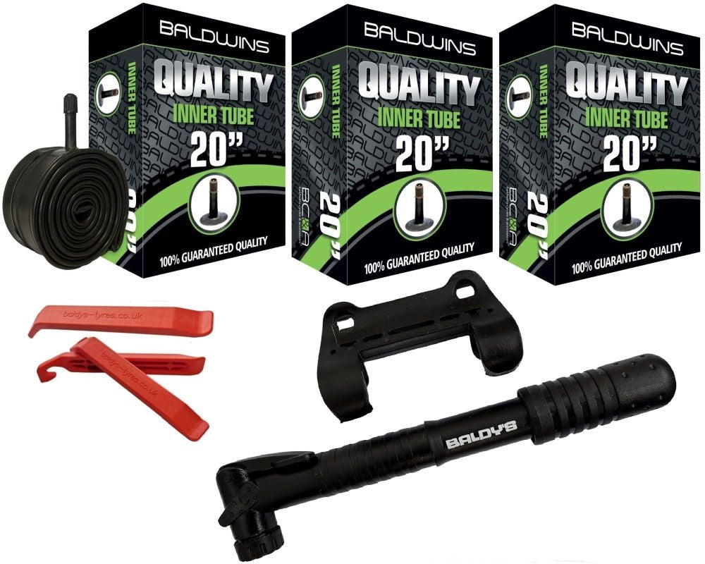Baldwins Bike Inner Tubes 20 x 1.75 to 2.125 Schrader Valve & Tyre Levers & Mini Pump (PACK OF 3)