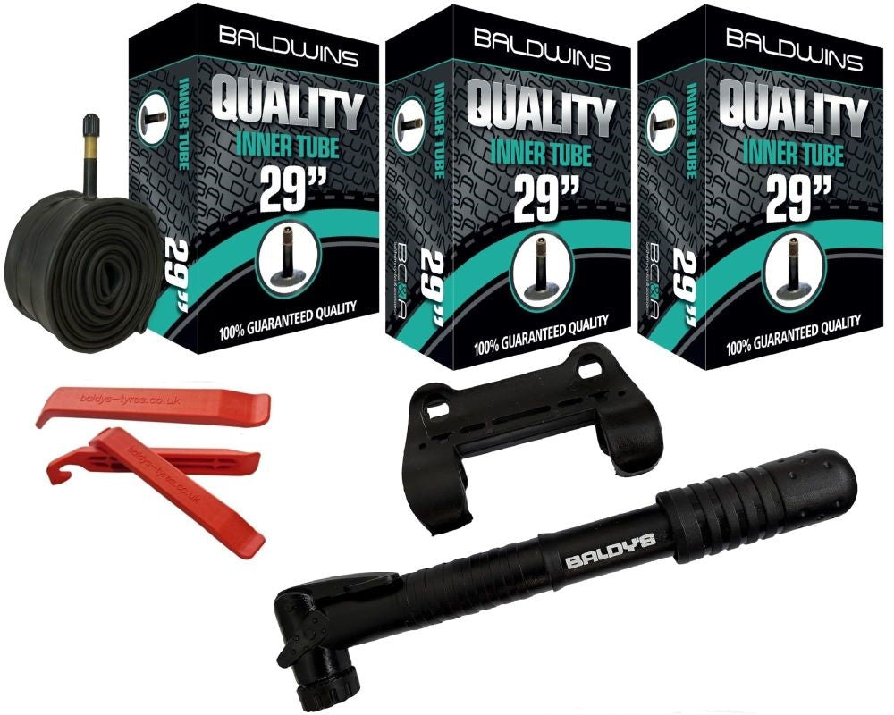 Baldwins Bike Inner Tubes 29 x 1.75 to 2.125 Schrader Valve & Tyre Levers & Mini Pump (PACK OF 3)