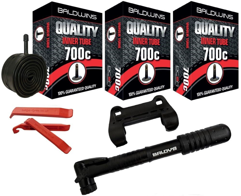 Baldwins Bike Inner Tubes 700 x 35c - 45c Schrader Valve & Tyre Levers & Mini Pump (PACK OF 3)