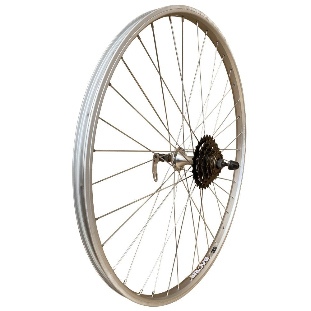 26" rear mountain bike wheel constructed with single wall alloy rim, alloy hub with quick release axle and silver steel spokes.
