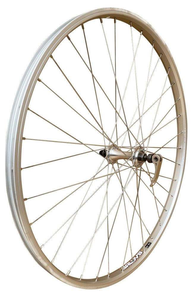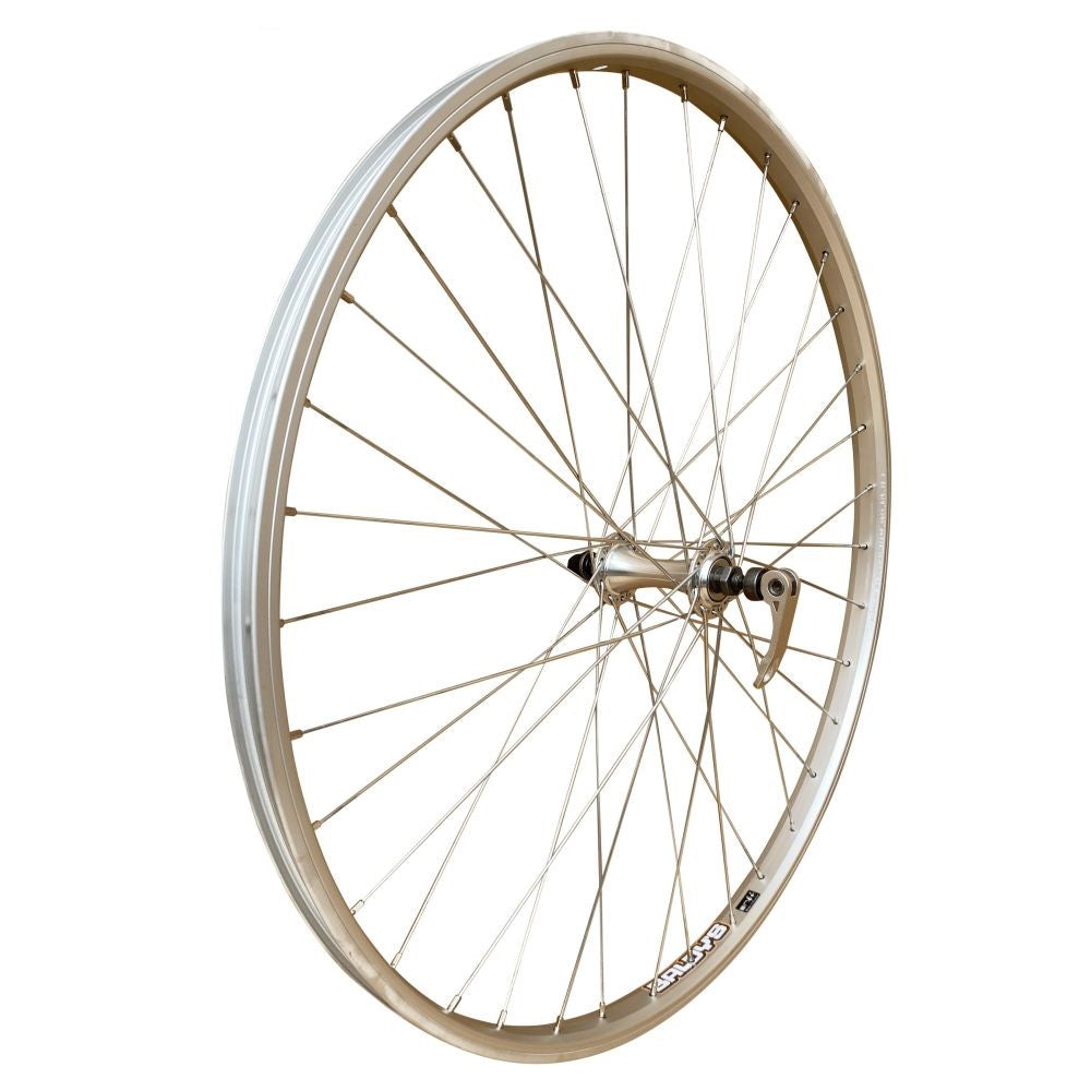 700c front hybrid bike wheel constructed with single wall alloy rim, alloy hub with quick release axle and silver steel spokes.