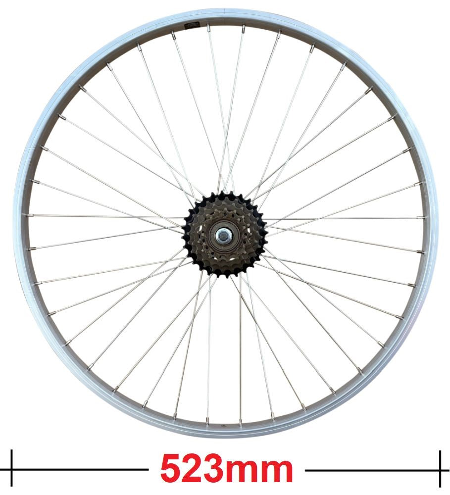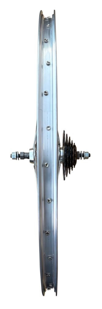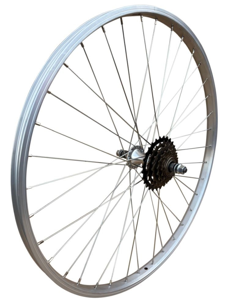 Our 5 speed 24" rear mountain bike wheel is constructed with Mach1 silver alloy rim, silky smooth sealed bearing hub with nutted axle and silver steel spokes.
