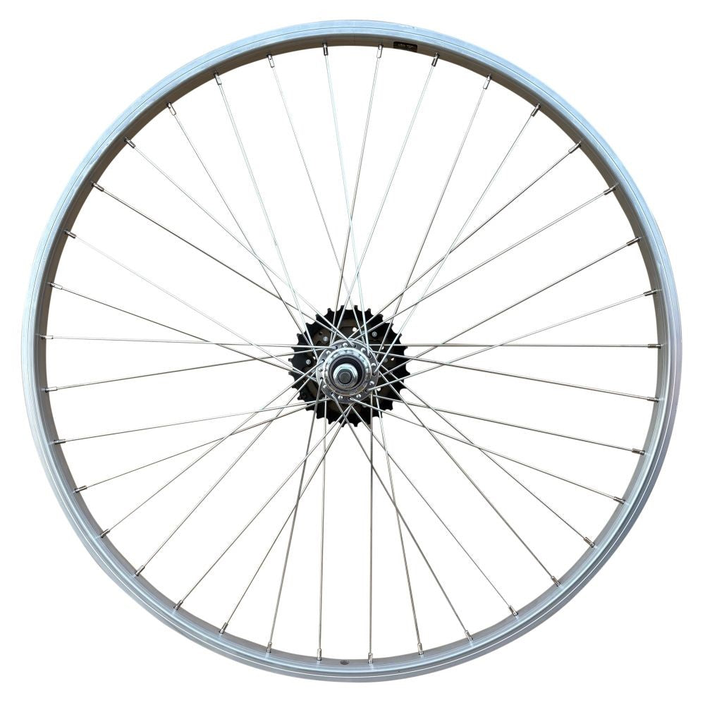 Our 6 speed 20" rear mountain bike wheel is constructed with Mach1 silver alloy rim, silky smooth sealed bearing hub with nutted axle and silver steel spokes.