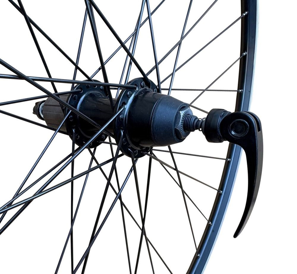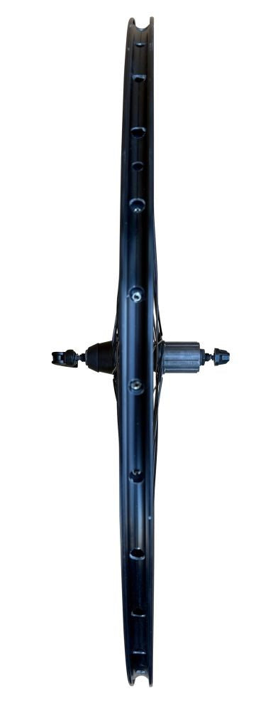 Our 700c rear road racing bike cassette wheel is suitable for all Shimano HG compatible 8,9,10 & 11 speed cassettes and is constructed with Mach1 black alloy double wall rim, black cassette hub with quick release axle and black steel spokes.