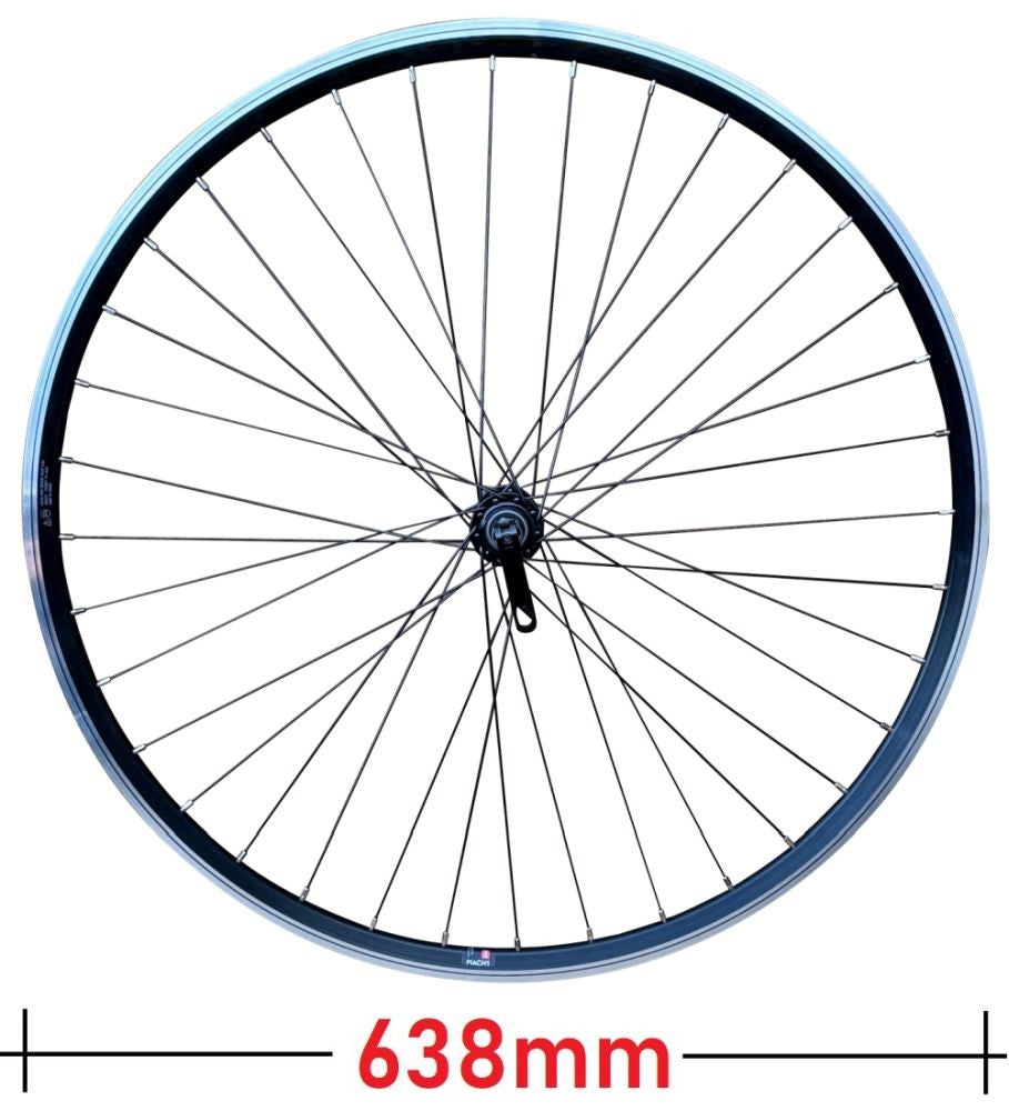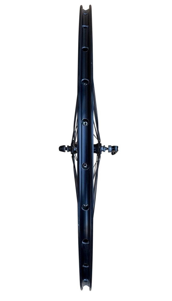 Our 700c front road racing bike wheel is constructed using Mach1 black alloy double wall rim, sealed bearing hub with quick release axle and black steel spokes.